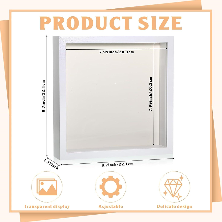 This set contains 16 square shadow box frames, each measuring 20.3 cm by 20.3 cm externally, with an internal depth of 3.8 cm. The frames are constructed from medium-density fibreboard (MDF) with a white painted finish. The front is made of clear acrylic. Each shadow box includes a removable backing board (white foam core) and a set of metal turn buttons to secure the back. The deep cavity (3.8 cm) allows for the preservation of wedding bouquets that have been dried (but not pressed flat), as well as small memorabilia such as shells, pins, medals, or small toys. The frames are suitable for both wall mounting (keyhole hangers included) and tabletop display (easel stand included). The set does not include any display contents. The acrylic front has protective film; remove prior to use. The 16-pack is intended for crafters, teachers for classroom projects, or event coordinators making multiple keepsakes. The white finish is matte, which resists fingerprints. The MDF is not waterproof; the product should be kept in dry indoor environments. The depth allows for layering of items, and the user may glue or pin items to the backing board. The product does not include any adhesives, pins, or tools. The acrylic is not scratch-resistant; handle with care. The frames are lightweight (each approx. 350g). The packaging is a single carton with dividers. The turn buttons are zinc-plated steel. The user may also use these frames for shadow box art projects, displaying small dried flower arrangements that are not completely flat. No claims are made about long-term prevention of dust ingress; the acrylic front is not airtight. The product is not a toy; small parts (turn buttons) could be a choking hazard. The frames are suitable for Mother’s Day gifts (DIY projects) as the user can customise the contents. The white paint is non-toxic after curing. This product complies with Canadian consumer goods standards for decorative frames.