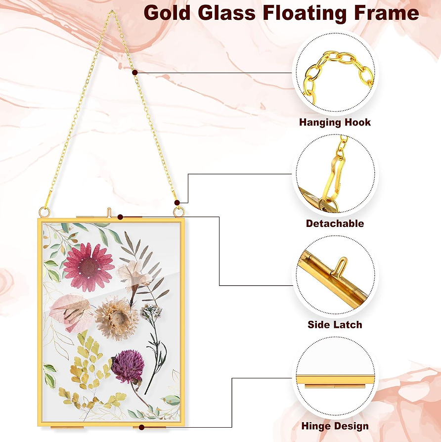 This bulk set includes 24 individual double-glass frames, each measuring 12.7 cm by 17.8 cm externally. The frames have a brass-coloured metal rim (steel with gold-toned plating) and are constructed with two panes of clear glass held together by metal clips. Each frame comes with a brass-toned hanging chain (approximately 20 cm length). The double glass design creates a “floating” effect when the user places pressed flowers or thin specimens between the two glass panes. The frames are sold as empty frames; they do not include dried flowers. The user supplies their own pressed botanicals, photographs, or paper items. The frame depth between the glass panes is approximately 3 mm, sufficient for most pressed flowers but not for thick or three-dimensional items. The frames can be hung individually or grouped for wall displays. The metal clips allow the frame to be opened for changing the contents; the user simply pries the clips open gently with a flat tool (not included). The product includes a small instruction card. The glass is not UV-protective; colour fading of inserted items may occur over time under direct sunlight. The frames are intended for indoor use only. The packaging is a single cardboard box containing all 24 frames separated by foam sheets. The chains are detachable. The brass-coloured finish may tarnish over time; cleaning with a soft dry cloth is recommended. The product does not contain any adhesives, magnets, or hanging hardware other than the chains. The frames can also stand on a desk using the chain as a support (looped behind), though they are primarily designed for hanging. The user may also insert thin fabric samples, pressed leaves, or translucent paper art. The glass is standard soda-lime glass and can break if dropped. This product is suitable for crafters, retailers, or event planners needing multiple frames for workshops or displays. No claims are made about archival protection. The frames are not airtight, so specimens may be affected by humidity over long periods. The product is not a toy and should be kept away from young children due to glass and small metal clips.