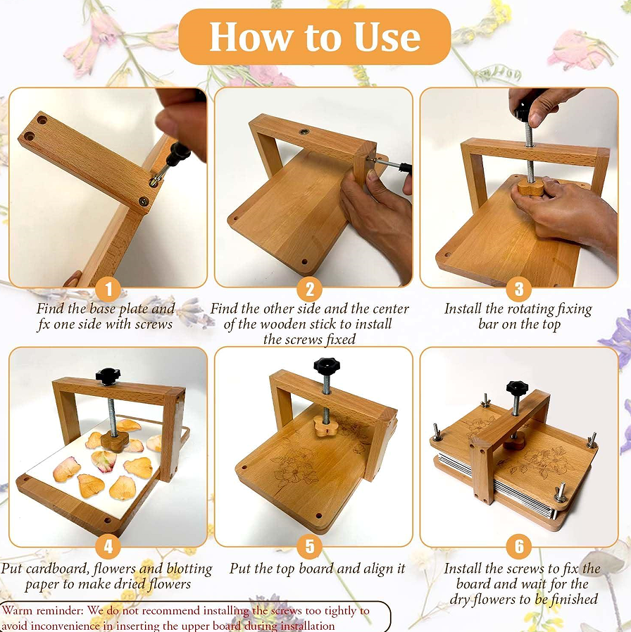 This large flower press kit features eight pressing layers and is constructed from beechwood, with external dimensions of 27.9 cm by 18.0 cm. The kit includes two beechwood boards (1.8 cm thick), four wing nuts with threaded rods, eight cardboard sheets, sixteen blotting paper sheets, and two fabric storage bags (one for the press itself, one for spare paper). The storage bags are made of unbleached cotton drawstring pouches, allowing the user to keep the press dust-free when not in use. The eight-layer configuration accommodates up to eight separate botanical pressing layers. The beechwood is untreated, which is intentional to allow moisture vapor to escape from the edges of the paper. The wing nuts are ergonomically shaped with plastic-coated tips for comfortable hand-tightening. The product is suitable for pressing garden flowers, wildflowers, leaves, and thin botanical specimens intended for resin art, scrapbooking, or home decoration. The user should rotate the blotting paper positions every few days to promote even drying. The storage bags can also be used to store dried flowers after pressing, keeping them away from humidity. The kit does not include any plant material. The drying time is typically 2–3 weeks. For faster drying, the user may place the press in a warm, dry location (not in direct sunlight) but not in an oven or microwave. The cardboard sheets are made from recycled material and are replaceable. The blotting paper is sized precisely to fit the press without overhang. This product is suitable for adults and supervised children over 10 years old. The manufacturer does not claim any specific colour retention performance. The wood is sourced from FSC-certified forests, though no certification mark is printed on the product. The storage bags are washable in cold water. The packaging is a printed cardboard box with a window to show the product. No additional tools are required. The user may use the press multiple times over many years; replacement blotting paper is available separately from craft suppliers. The product is not intended for commercial bulk drying operations.