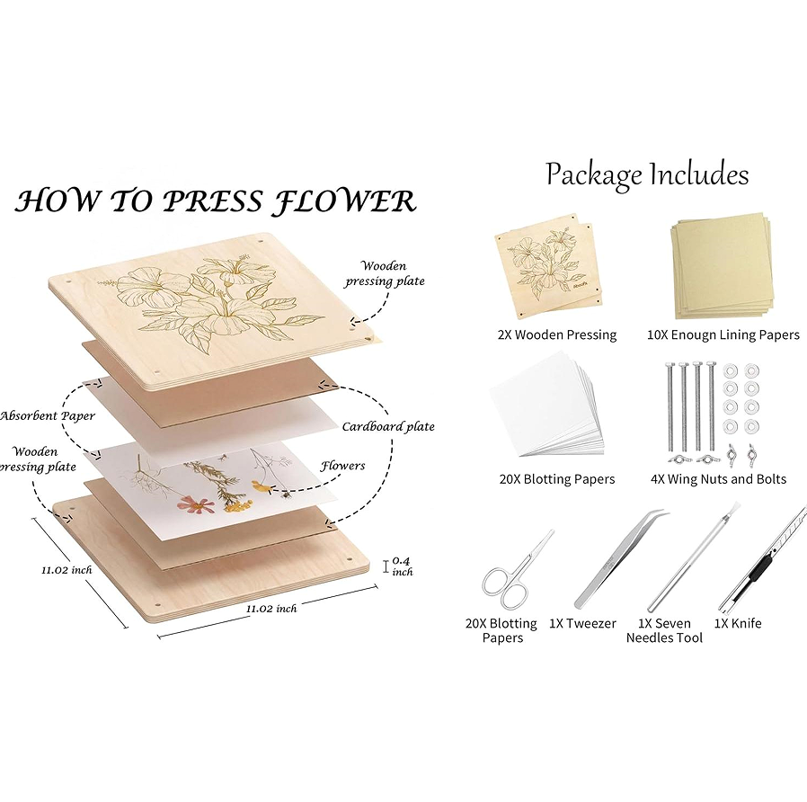 This extra large wooden flower press kit offers expanded dimensions of 35.6 cm by 28.0 cm, providing a generous pressing area for larger botanical specimens or bulk processing. The kit includes two solid oak boards (each 1.8 cm thick), four metal wing nuts, four threaded rods (20 cm length), eight cardboard corrugated sheets, and thirty blotting paper sheets. The large size accommodates whole flowers up to 30 cm in length, including long-stemmed roses, delphinium spires, and lily petals. The thirty blotting papers allow the user to change papers frequently without needing to purchase replacements immediately. The oak wood is chosen for its density and durability; it resists warping even under prolonged pressure from moist plant material. The user may press multiple layers — up to ten — depending on the thickness of the plants. Typical applications include pressing wedding bouquet flowers, garden harvests for resin art embedding, or creating pressed flower specimens for botanical reference. The press also serves as a tool for drying herbs for potpourri (non-culinary). The assembly process requires no tools beyond the included wing nuts. The blotting paper is unbleached and highly absorbent. The cardboard sheets have a fluted design to promote air circulation between layers. The product does not contain any flowers or plant material. This kit is suitable for both adults and children under supervision (ages 8+). The wing nuts and rods are galvanised steel; they may show minor surface rust if stored in humid conditions, but this does not affect function. The user should not use this press with microwave or oven heat. The drying time varies from 2 to 4 weeks. The product does not claim to preserve flower colour indefinitely; some fading is natural. The packaging is a plain corrugated box with a printed label. This press is also suitable for pressing leaves for classroom activities. No instructional booklet is included beyond a one-sheet diagram. The user accepts responsibility for monitoring for mould growth; if mould appears, discard affected blotting paper and wipe boards with diluted vinegar (allow to dry thoroughly before reuse).