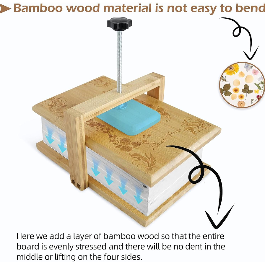 This large flower press kit measures 29.5 cm by 20.1 cm and features an even-pressure design using four corner bolts. The construction uses maple wood boards (each 1.8 cm thick), chosen for its hardness and resistance to denting under pressure. The kit includes two maple boards, four wing nuts, four threaded rods (18 cm length), ten cardboard sheets, and twenty blotting paper sheets. The wood is finished with a natural tung oil coating, which provides some moisture resistance without sealing the wood completely. The even-pressure mechanism ensures that flowers near the edges of the boards receive the same compression as those in the centre. This is particularly important for large presses where uneven pressure could cause wrinkled specimens. The kit can accommodate up to eight pressing layers using the included cardboard sheets, or up to ten layers if the user adds their own cardboard (not included). The blotting paper is made from high-absorbency cellulose and is acid-free. The typical drying time for low-moisture flowers (e.g., pansies, violas) is 10–14 days; for higher moisture flowers (e.g., roses, peonies), up to 3–4 weeks with paper changes every 2 days initially. The product does not include any plant material. This press is suitable for preserving wedding bouquets, garden flowers for resin art, or creating botanical specimens for framing. The kit makes a suitable gift for plant and craft enthusiasts. The packaging is a gift-ready cardboard box with a kraft paper sleeve and a descriptive hang tag. The user should not use this press in a microwave or expose it to direct heat. The wing nuts are ergonomically shaped with rubberised grips for comfortable hand tightening. The maple wood has a light, uniform colour that resists staining. The product includes a small card with pressing tips, but no full instruction manual. The user may replace blotting paper with standard craft paper cut to size. The press is also suitable for pressing thin fabrics or paper flowers, though the primary intended use is botanical. The tung oil finish is food-safe once cured, but the product is not intended for food contact. No claims are made regarding the prevention of mould; the user must ensure plants are dry to the touch before pressing.